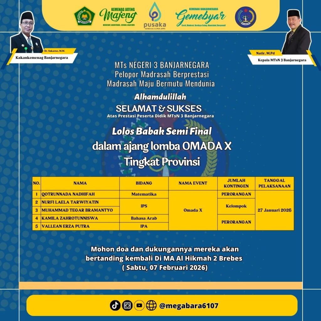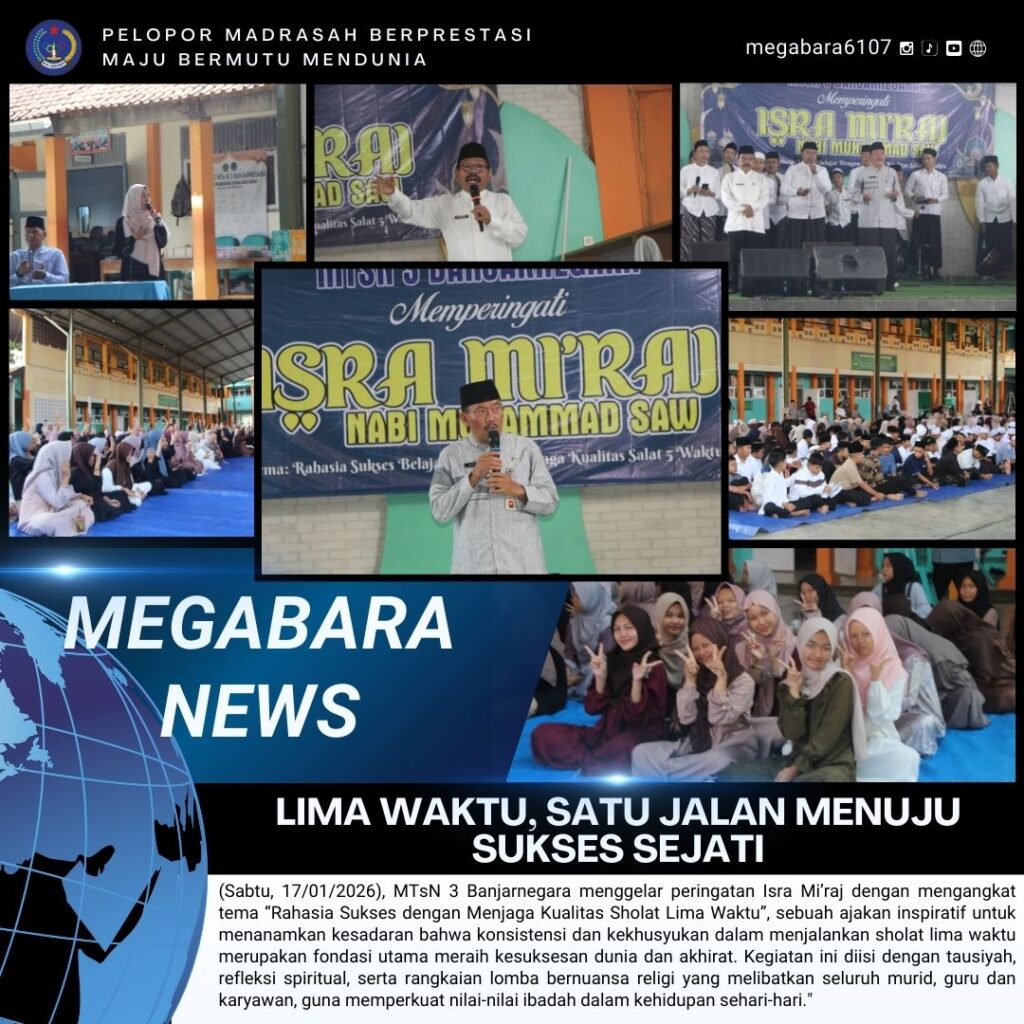 (Sabtu, 17/01/2026), MTsN 3 Banjarnegara menggelar peringatan Isra Mi’raj dengan mengangkat tema “Rahasia Sukses dengan Menjaga Kualitas Sholat Lima Waktu”, sebuah ajakan inspiratif untuk menanamkan kesadaran bahwa konsistensi dan kekhusyukan dalam menjalankan sholat lima waktu merupakan fondasi utama meraih kesuksesan Read More …