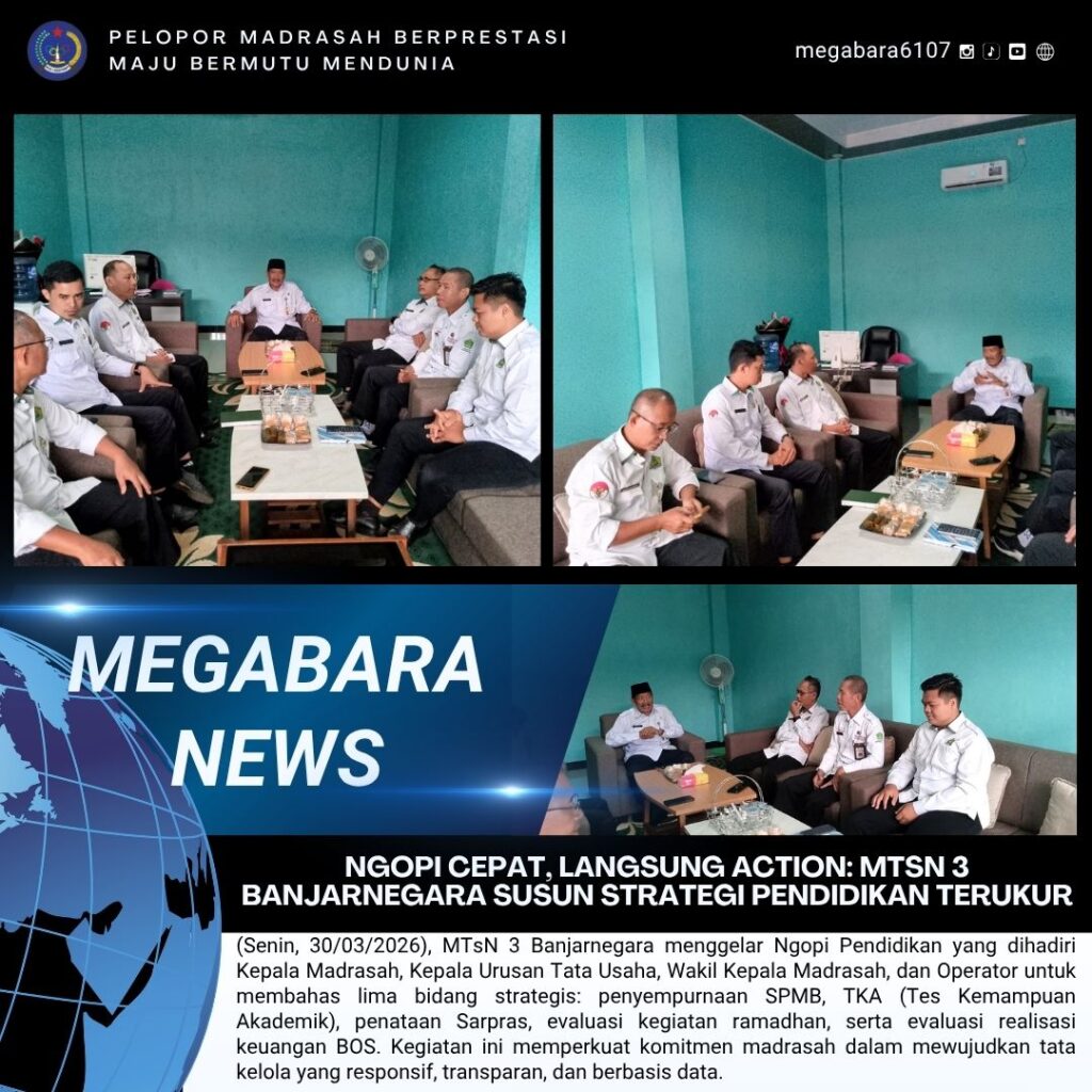 (Senin, 30/03/2026), MTsN 3 Banjarnegara menggelar Ngopi Pendidikan yang dihadiri Kepala Madrasah, Kepala, Urusan Tata Usaha, Wakil Kepala Madrasah, dan Operator untuk membahas lima bidang strategis: penyempurnaan SPMB, TKA (Tes Kemampuan Akademik), penataan Sarpras, evaluasi kegiatan ramadhan, serta evaluasi realisasi Read More …