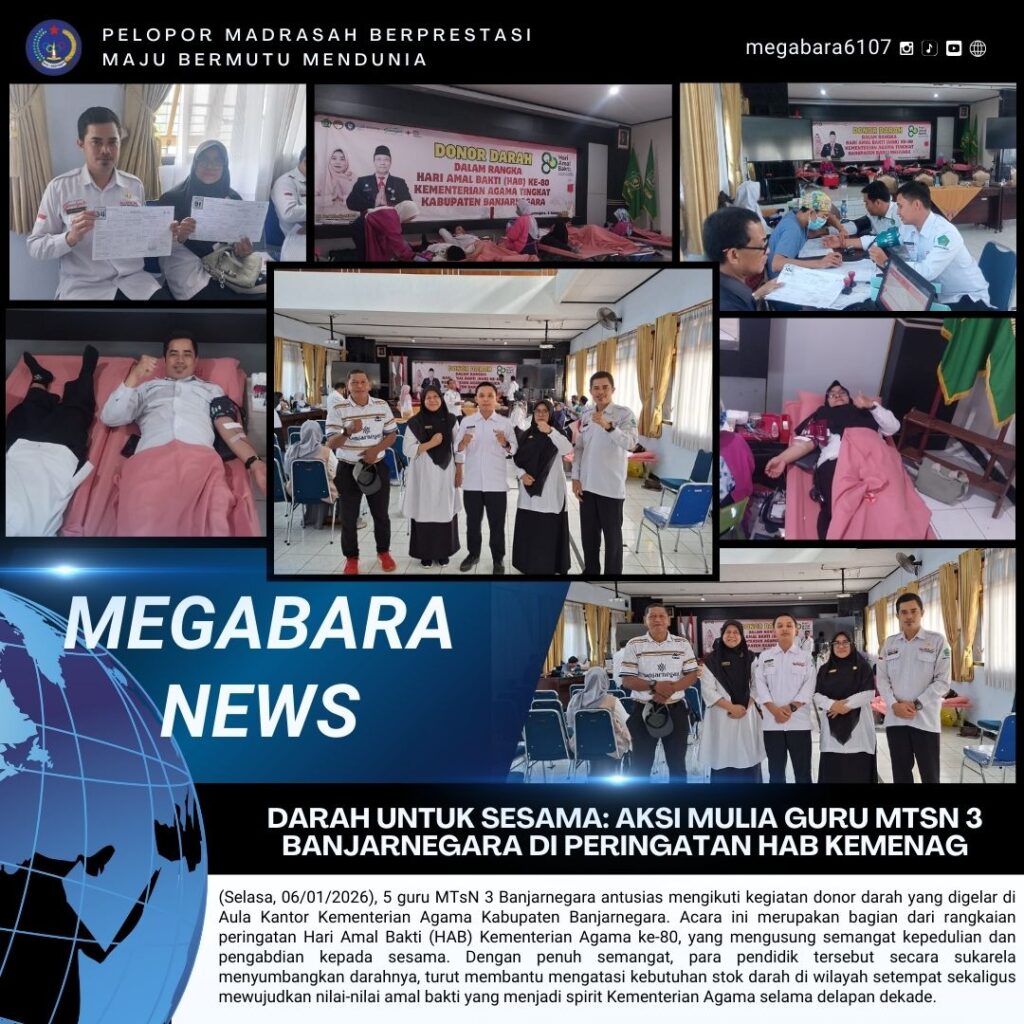 (Selasa, 06/01/2026), 5 guru MTsN 3 Banjarnegara antusias mengikuti kegiatan donor darah yang digelar di Aula Kantor Kementerian Agama Kabupaten Banjarnegara. Acara ini merupakan bagian dari rangkaian peringatan Hari Amal Bakti (HAB) Kementerian Agama ke-80, yang mengusung semangat kepedulian dan Read More …